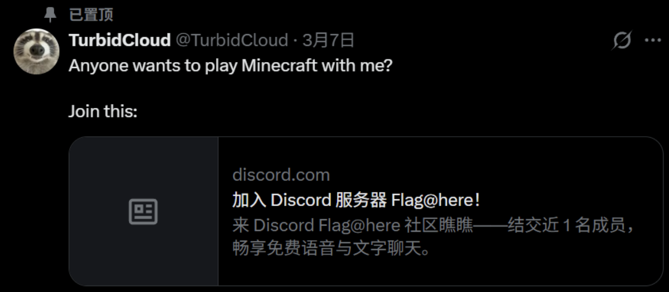 访问一下账号主页,能看到一个 discord 服务器的邀请链接,名为 Flag@here