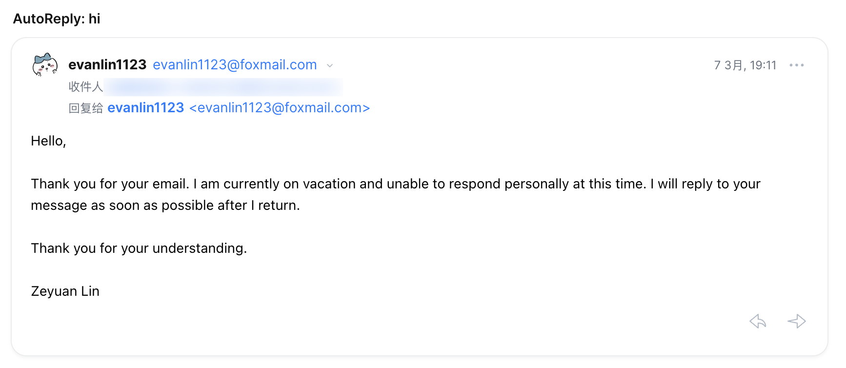 向 evanlin1123@foxmail.com 发送一封任意内容的邮件,即可收到回复: